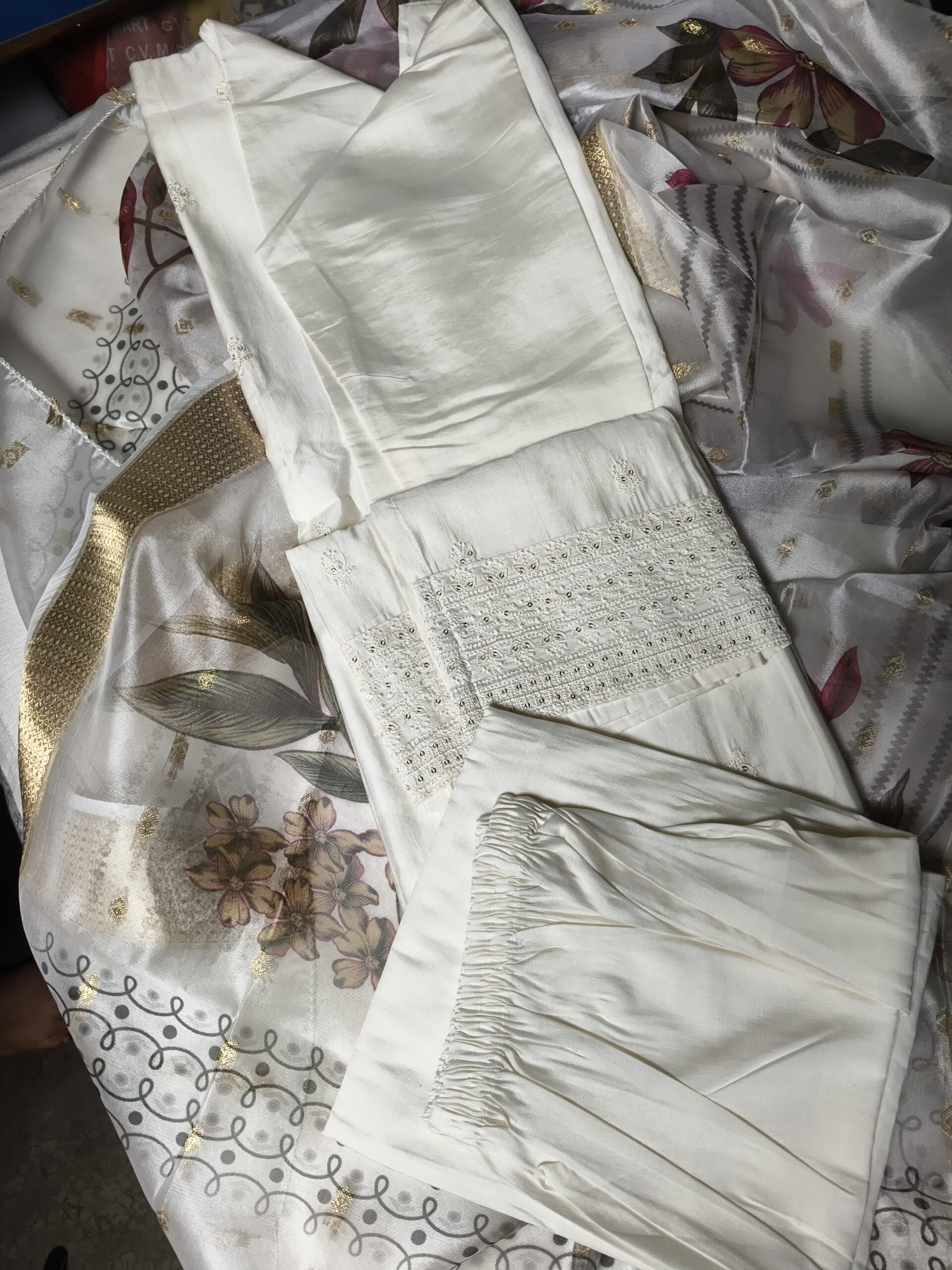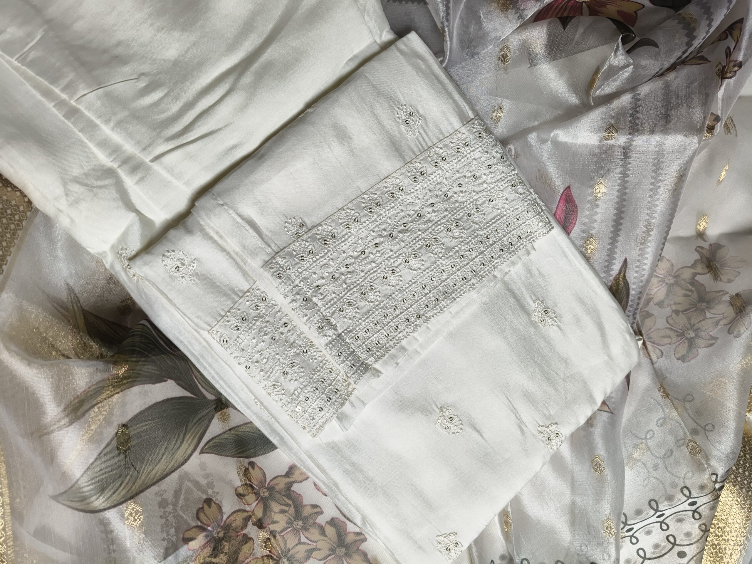 Paired with a soft matching bottom and a beautifully printed dupatta adorned with golden motifs, this outfit blends tradition with contemporary finesse. The gentle ivory tone with hints of gold and floral accents makes it a versatile choice for both day and evening wear.