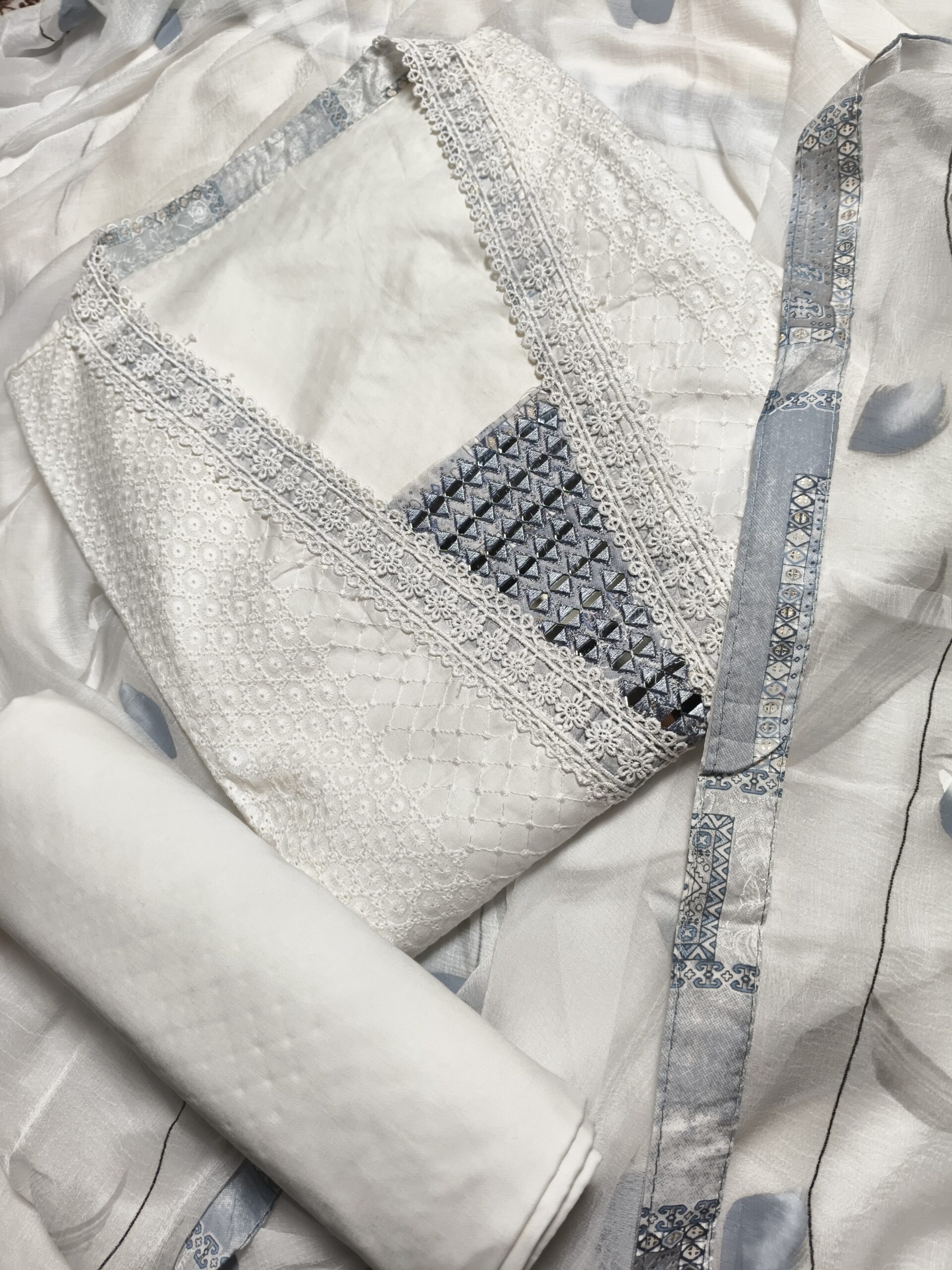 This unstitched suit features a beautifully detailed white cotton fabric adorned with delicate thread embroidery and lace work on the neckline and front panel. The highlight of the outfit is the mirror and geometric embroidery detailing that adds a subtle sparkle and modern charm.